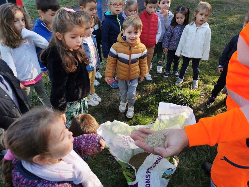 Début octobre, nous sommes sortis de l’école pour notre première promenade « découverte »des alentours de l’école. Nous avons collecté des marrons, bogues, feuilles, noisettes, plumes…nous avons rencontré et discuté avec l’employé communal et nous avons testé le parcours « sportif ». De retour dans la classe, nous avons trié et catégorisé nos récoltes.