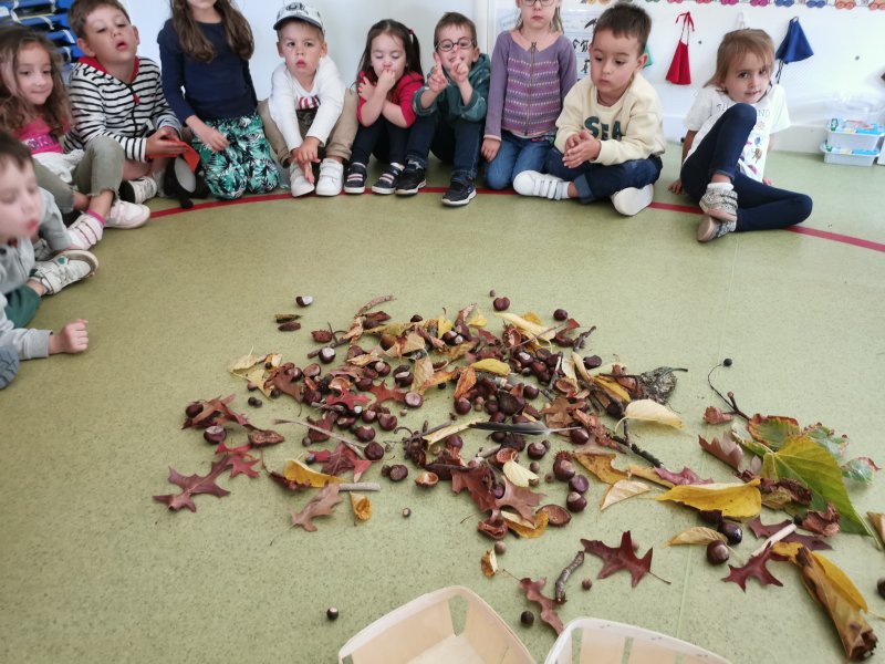 Début octobre, nous sommes sortis de l’école pour notre première promenade « découverte »des alentours de l’école. Nous avons collecté des marrons, bogues, feuilles, noisettes, plumes…nous avons rencontré et discuté avec l’employé communal et nous avons testé le parcours « sportif ». De retour dans la classe, nous avons trié et catégorisé nos récoltes.